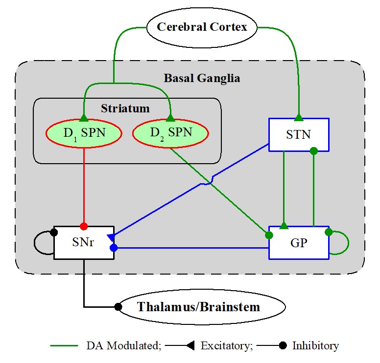 (D1 SPN ¡æ SNr) facilitating movement and indirect pathway (D2 SPN ¡æ GP ¡æ STN ¡æ SNr)